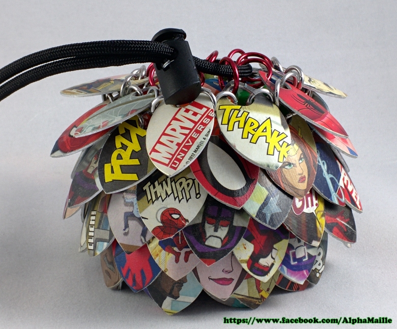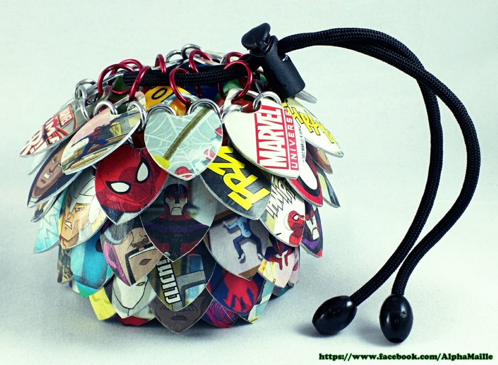 This custom bag is made of our standard aluminum rings and scales. We've attached a red chain mail "cup" base, sorry we are fresh out of vibranium and adamantium currently. However since we didn't use those precious metals we will pass the savings on to you!