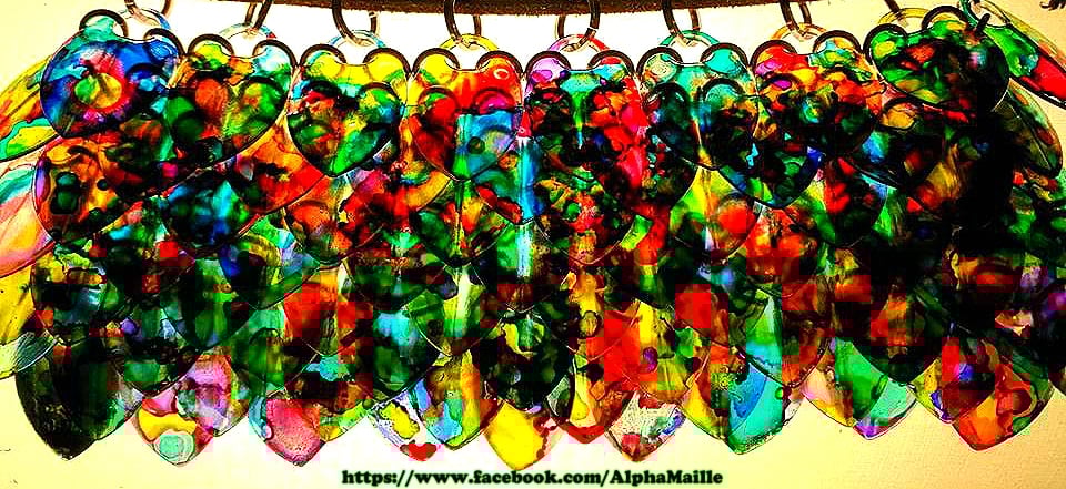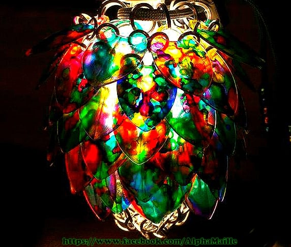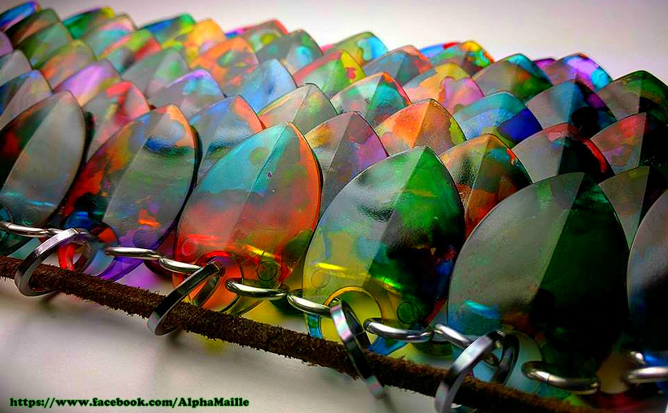 This beautiful bag is created with clear polycarb scales. Each individual scale has been hand dyed and sealed to protect the color.