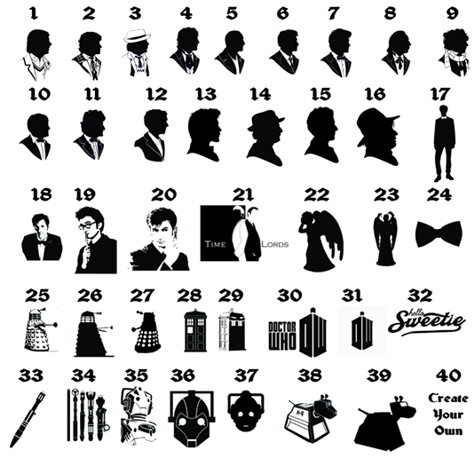 Celebrate your love of all things Dr Who with images featuring the iconic tardis, sonic screwdrivers, daleks, K-9s, cybermen and each doctor's silhouette just to name a few.