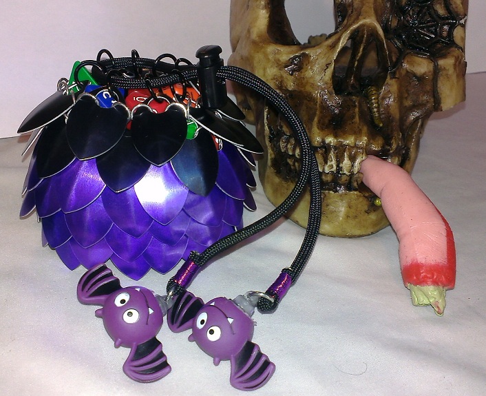 You will go absolutely batty over this Halloween themed bag. It is made of black and purple anodized aluminum scales complete with a purple anodized chainmail cup. Drawstring is comprised of 550 military grade parachute cord. A sturdy high tension cordlock holds the bag closed ensuring you will not lose any of your precious dice. 2 bats adorn the end of the drawstring with purple wire wrap as an accent.